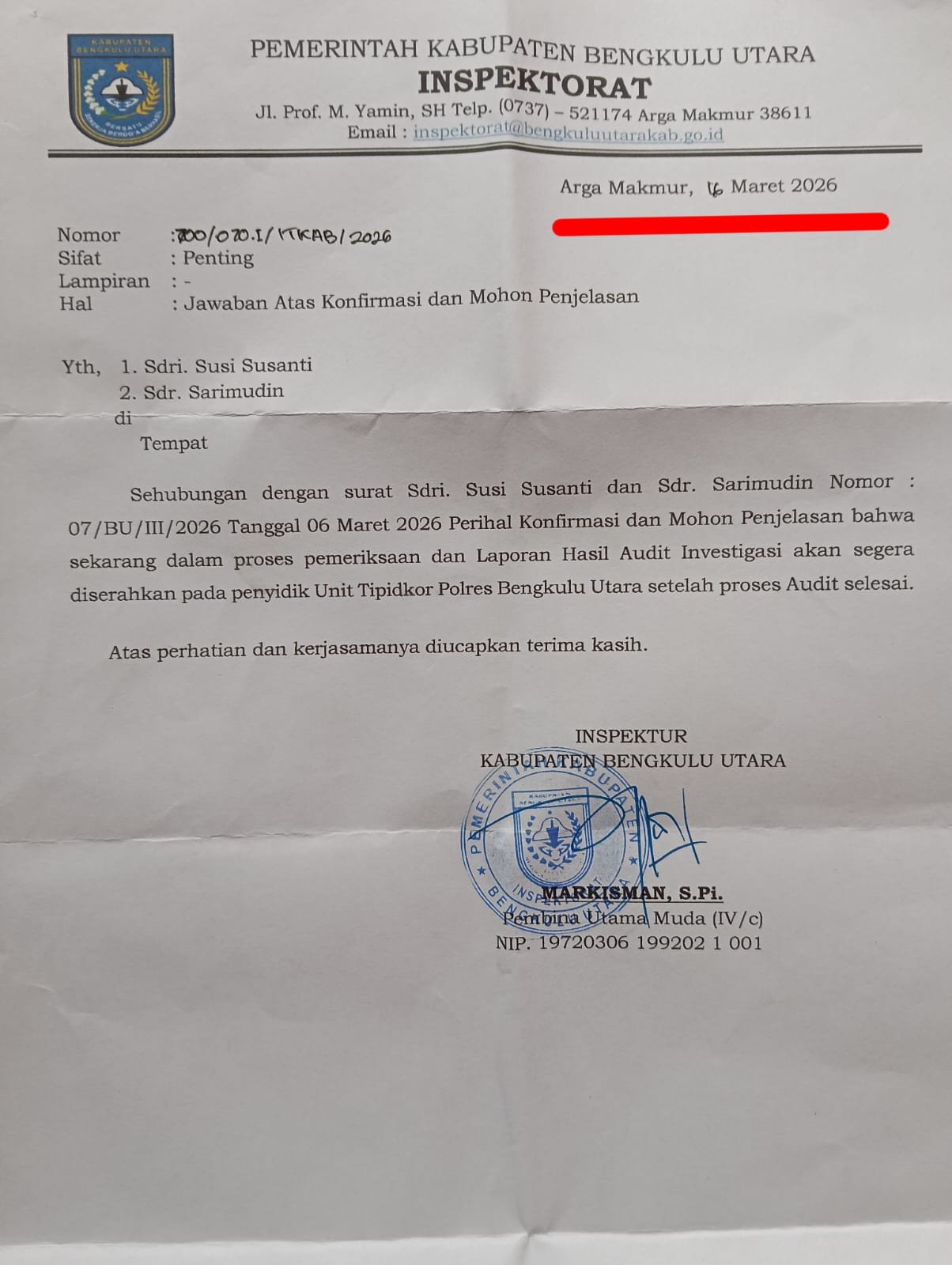 Kemudian, melalui surat lanjutan dari Inspektorat Bengkulu Utara tertanggal 16 Maret 2026 yang diterima pelapor pada 5 April 2026, dijelaskan bahwa proses pemeriksaan masih berlangsung. Inspektorat menyatakan bahwa laporan hasil audit investigasi akan segera diserahkan kepada penyidik Unit Tipidkor Polres Bengkulu Utara setelah proses audit selesai.