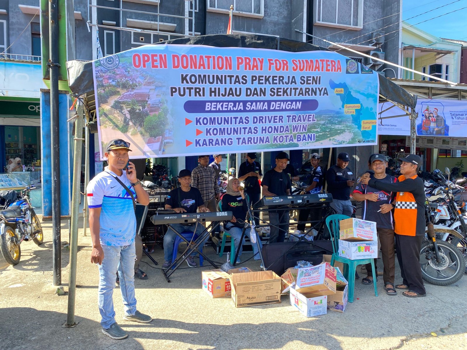 Pena Serawai — Bentuk kepedulian terhadap sesama kembali ditunjukkan oleh Komunitas Pekerja Seni Putri Hijau dan sekitarnya yang berkolaborasi bersama Komunitas Driver Travel, Komunitas Honda Win, serta Karang Taruna Kota Bani dengan menggelar aksi penggalangan donasi untuk korban bencana alam yang melanda wilayah Sumatra, khususnya Aceh, Sumatra Utara, dan Padang.