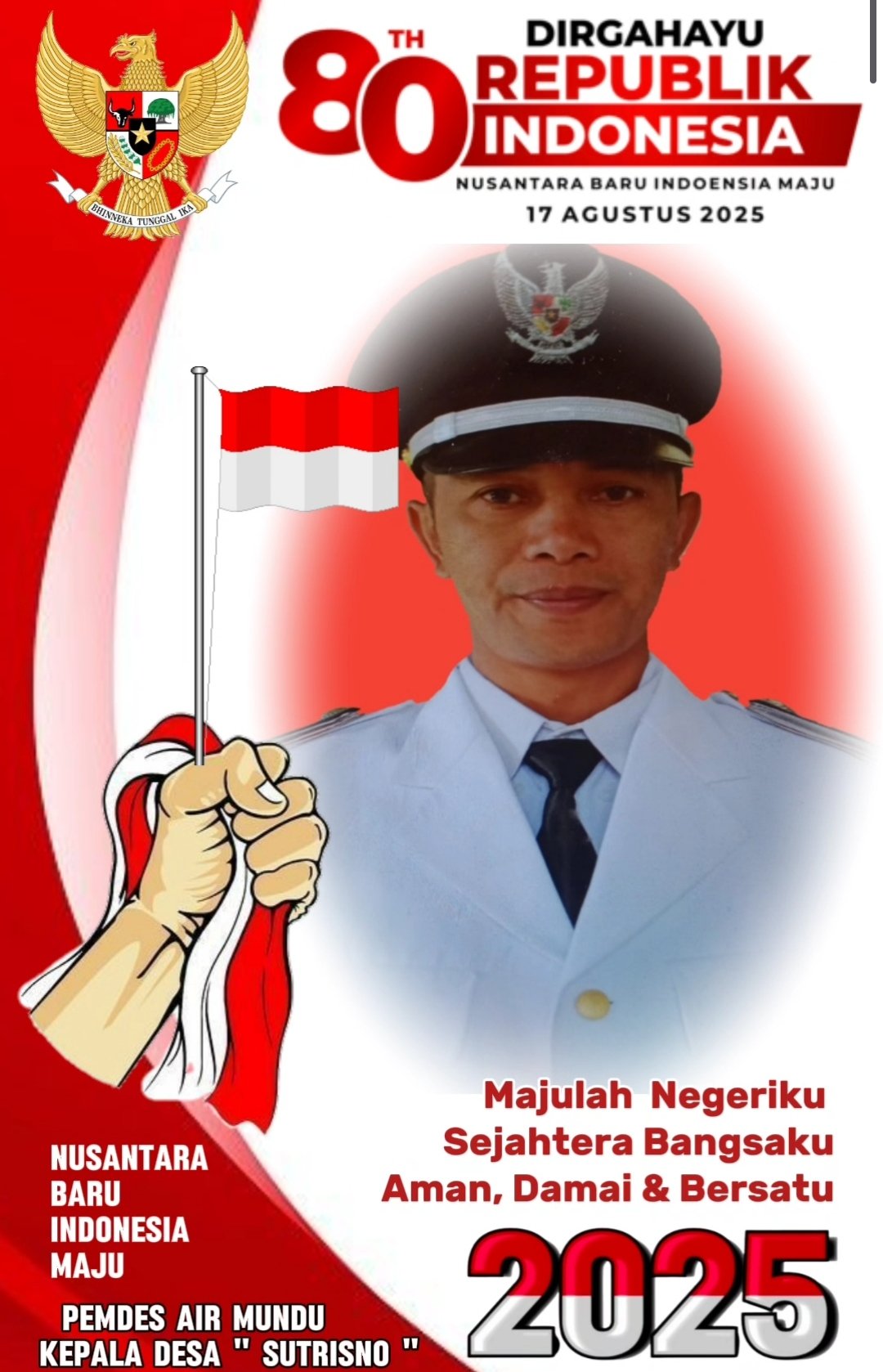 Pemerintah Desa Air Mundu mengucapkan Dirgahayu Republik Indonesia ke-80. Mari kita lanjutkan semangat perjuangan para pahlawan dengan memperkuat persatuan, menjaga gotong royong, serta berkomitmen membangun desa dan bangsa menuju Indonesia yang maju, adil, dan sejahtera.